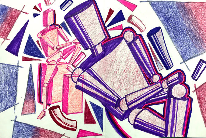This lesson took place in 9th and 10th grade classes, following basic exercises related to figure drawing from a live model. The skills that they have have been built upon in an ascending order in terms of difficulty and sophistication. This project utilizes new and specific methods for figure drawing, while incorporating design elements and a strong sense of composition. The students were also encouraged to create some kind of narrative between the figures.